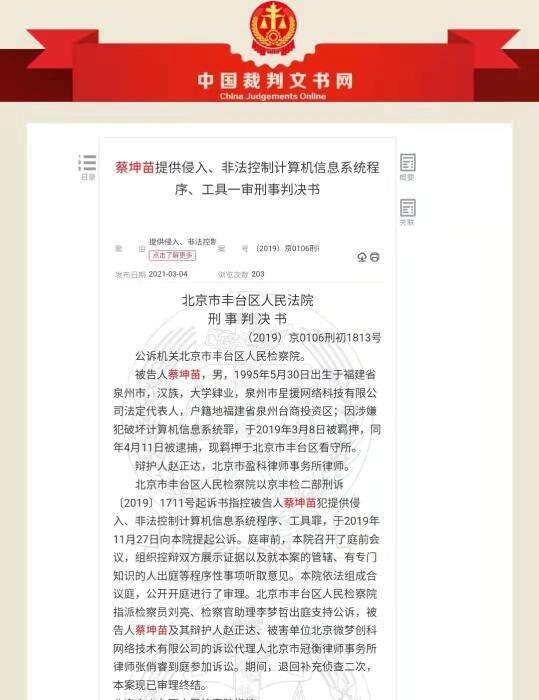2021年3月,中国裁判文书网公布了“星援”APP开发者蔡坤苗的判决书,判处其提供侵入计算机信息系统程序罪。
