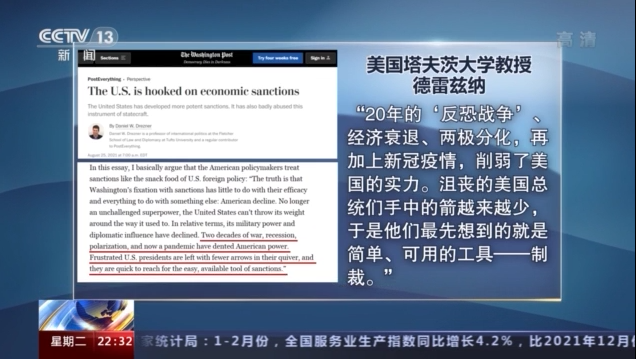 美国塔夫茨大学教授德雷兹纳则在《华盛顿邮报》撰文指出,20年的“反恐战争”、经济衰退、两极分化,再加上新冠疫情,削弱了美国的实力。“沮丧的美国总统们手中的箭越来越少,于是他们最先想到的就是简单、可用的工具——制裁。”