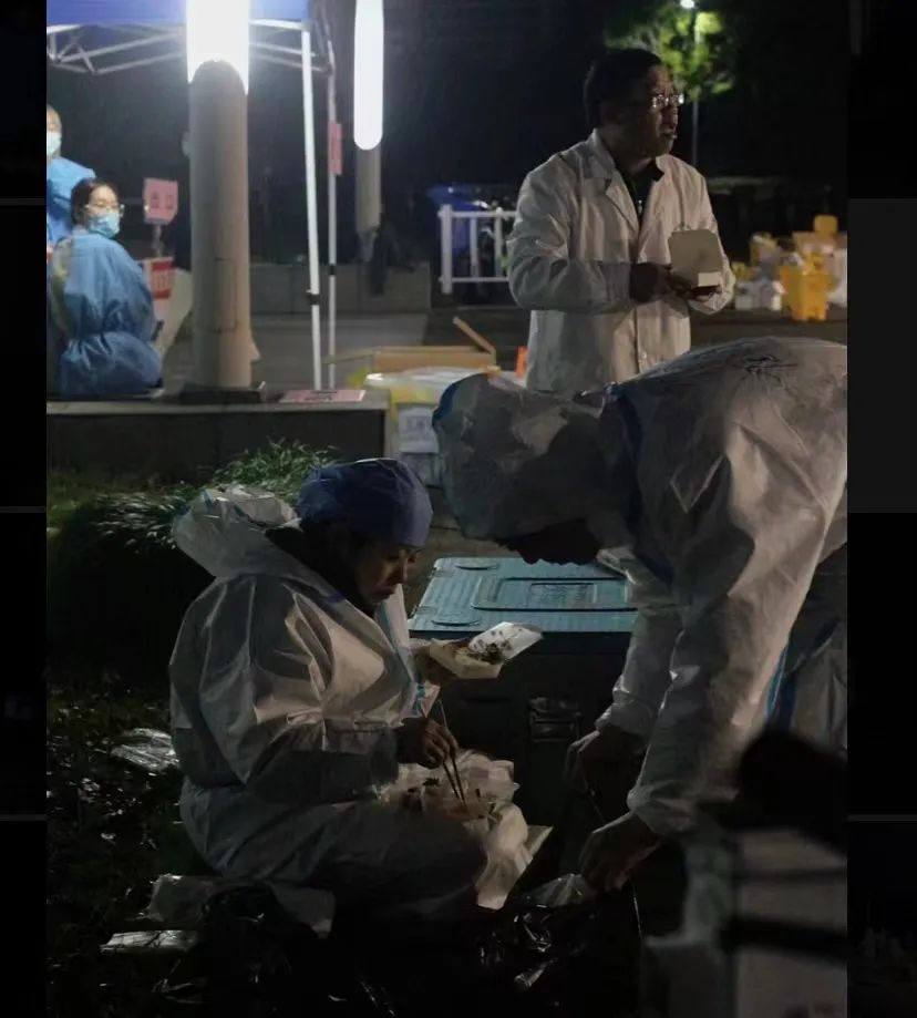 图为医护人员抢时间“风餐露宿”的场景