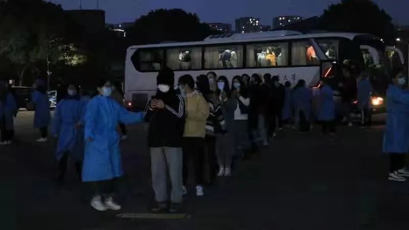 图为学校调度车辆接送师生观测