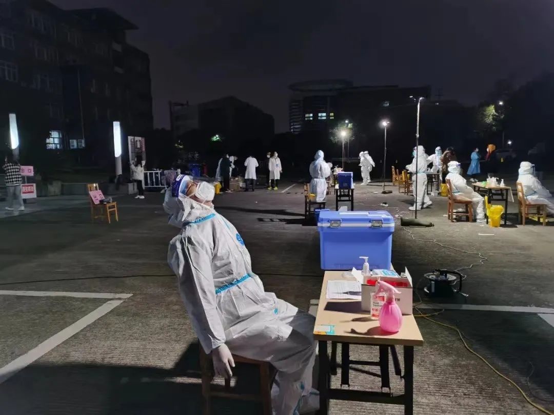 图为检测结束后医护人员累到直靠椅上休息