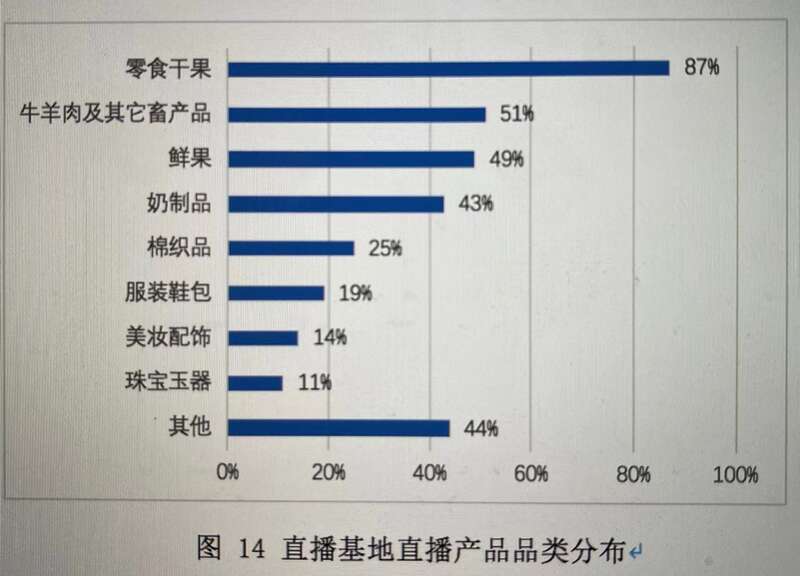 2021年,新疆数字经济研究院对新疆57个国家电子商务进农村综合示范县的直播基地进行问卷调查。调研发现,直播基地体量偏小,包括主播数量较少、入驻商家数量较少、基地直播间数量较少、年产值偏低;在直播产品品类方面,按产品品类占比量依次是零食干果、牛羊肉及其他畜产品、鲜果、奶制品、棉织品等;其中,大多数直播基地成立于近两年,开设于2021年和2020年的直播基地分别占比32.7%和36.5%。
