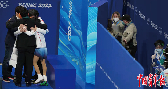 2月19日晚,北京首都体育馆,北京冬奥会花样滑冰双人滑自由滑的比赛结束后,中国花样滑冰队总教练赵宏博与获得花样滑冰双人滑冠军的隋文静、韩聪等拥抱庆祝。中青报·中青网记者 李隽辉/摄