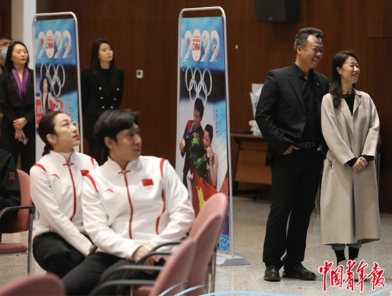 3月18日,中国文联报告厅,中国花样滑冰协会主席申雪(右一)、中国花样滑冰队总教练赵宏博(右二)与北京冬奥会花样滑冰双人滑冠军隋文静(左一)、韩聪(左二)等观看视频短片。中青报·中青网记者 陈剑/摄