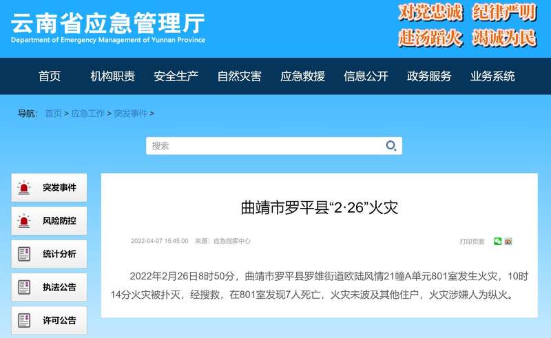 4月7日,云南省应急管理厅发布通报,2月26日8时50分,云南省曲靖市罗平县罗雄街道欧陆风情21幢A单元801室发生火灾,10时14分火灾被扑灭。经搜救,在801室发现7人死亡,火灾未波及其他住户。火灾涉嫌人为纵火。