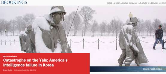 美国智库布鲁金斯学会2017年一份报告显示,美国卷入朝鲜战争是一场由错误情报造就的灾难,这一战争原本可以避免,它对美国而言是永恒的教训。