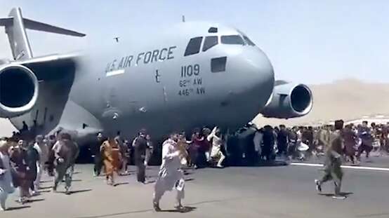 图为2021年8月,美军仓皇撤离阿富汗期间,一架美军运输机起飞时碾压试图阻拦飞机并登机的阿富汗难民