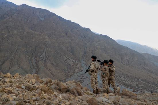 当天下午3点多,经过一段时间的跋涉,巡逻队来到一个近70度的陡坡下。太阳直射茫茫雪原,官兵们要踩着冰雪贴在崖边行走。“崖上的石块被冰雪覆盖,锋利如刀,稍有不慎就会滑倒。”连长赵利军提醒第一次参加巡逻的文添,随后自己走到队伍最前面涉险开道。