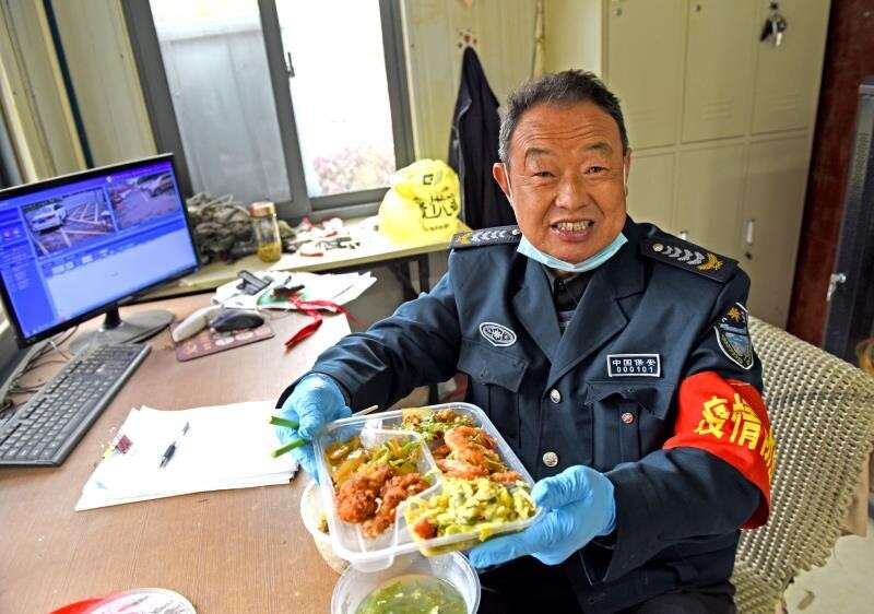 泉山社区门卫拿到姚荣顺和刘云制作的免费爱心餐。陈彬摄