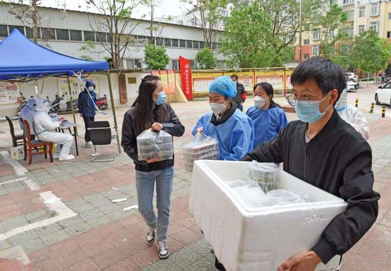 4月13日,安徽省淮南市田家庵区90后夫妻姚荣顺、刘云将制作的免费爱心餐送给泉山社区一线战疫人员。陈彬摄