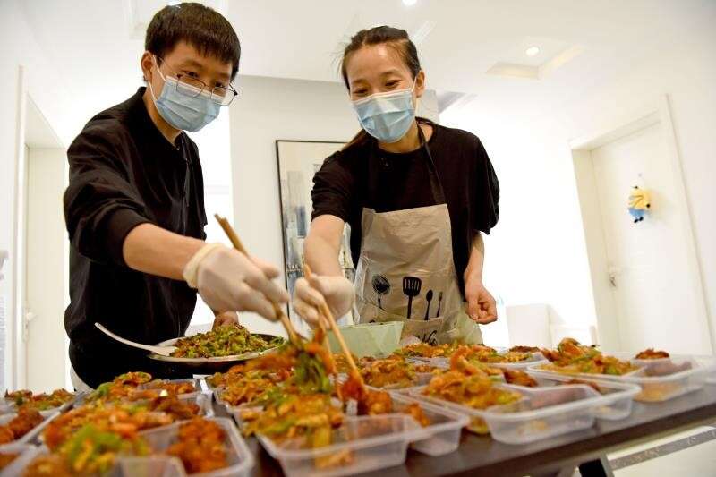 4月13日,安徽省淮南市田家庵区90后夫妻姚荣顺、刘云在居住的出租房里做爱心餐,免费送给社区一线战疫人员。