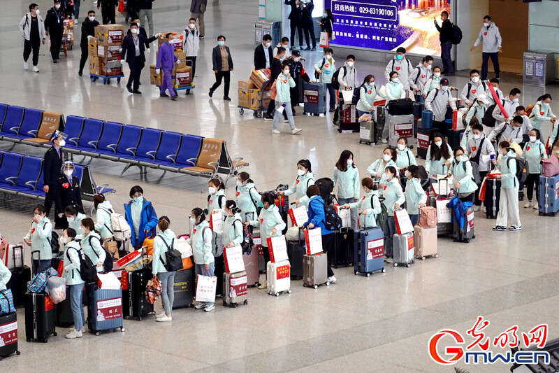2022年4月15日,陕西援沪医疗队1591名医务人员分批乘坐高铁列车出发前往上海。张远摄/光明图片/视觉中国