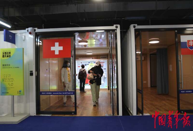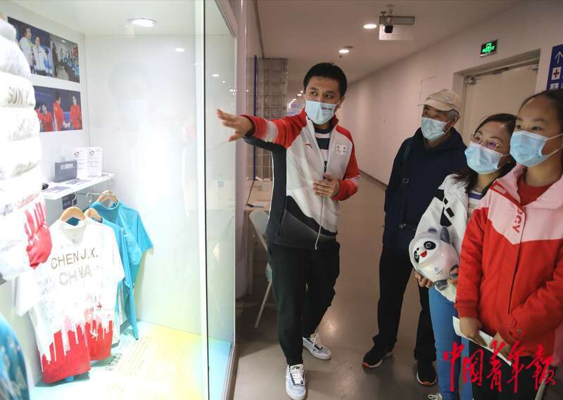 4月16日,北京,国家游泳中心,市民在中国冰壶队的展示柜前驻足参观。中青报·中青网记者 陈剑/摄
