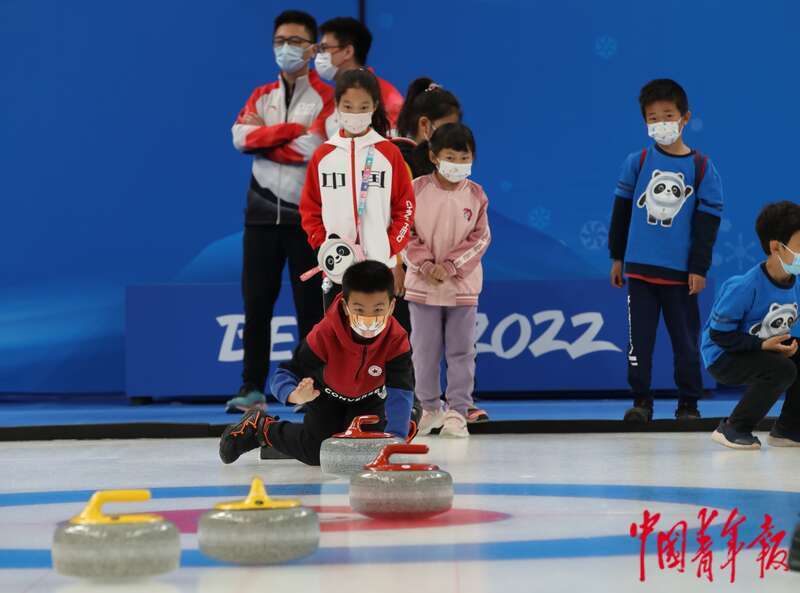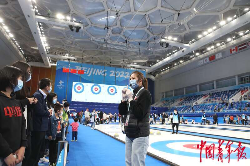 4月16日,北京,国家游泳中心(又称“水立方”、“冰立方”),市民在志愿者的引导下体验冰壶运动。当日,在北京冬奥会、冬残奥会之后,国家游泳中心首次面向公众开放。市民走进这座顶级冬奥冰上场馆,了解相关冰雪赛事,体验冰壶运动,感受双奥文化。中青报·中青网记者 陈剑/摄