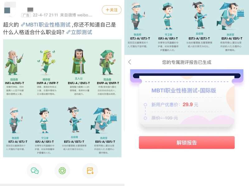 MBTI的大热也带动起各类心理咨询相关的商业营销。随机点开一个推广链接,做完93道题,还要付费几十元才能查看结果。一家注册于一年前的微信公众号主页显示,已有近20万人购买了该公司的MBTI测试,并进一步推广不同价格的职业咨询和MBTI课程。
