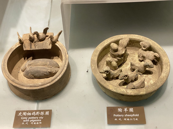 中国农业博物馆展品,汉代陶羊圈和灰陶栖鸽卧豚圈。齐征/摄