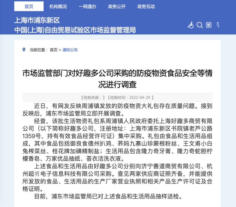 上海浦东市场监管部门20日发布消息称,近日,有网友反映上海市浦东新区周浦镇发放的防疫物资大礼包存在质量问题。接到反映后,市场监管部门开展了调查,并对相关食品和生活用品抽样送检。