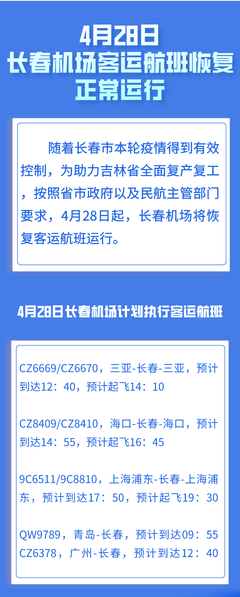 “长春龙嘉国际机场”微信公众号27日消息,随着长春市本轮疫情得到有效控制,为助力吉林省全面复产复工,按照省市政府以及民航主管部门要求,4月28日起,长春机场将恢复客运航班运行。