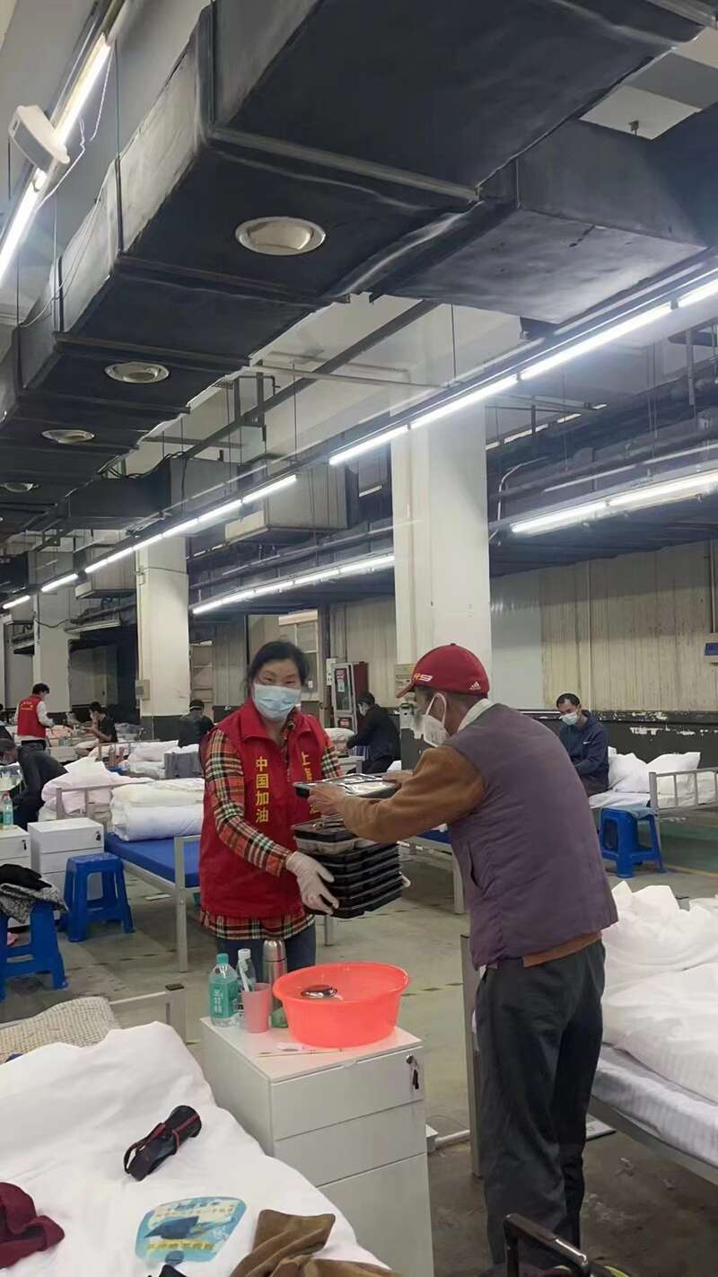 石龙路方舱医院里,志愿者们在帮助分发盒饭(赵小静 摄)