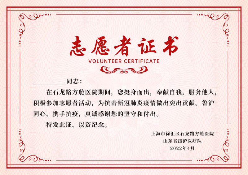 山东省立医院团队特别定制的志愿者证书(图片由山东省援沪医疗队提供)