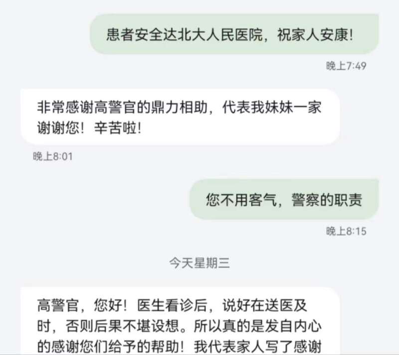 次日上午,柳女士发来短信告知她妹妹的情况,“医生看诊后,说好在送医及时,否则后果不堪设想。真的是发自内心地感谢你们给予的帮助,我代表家人写了感谢信。”