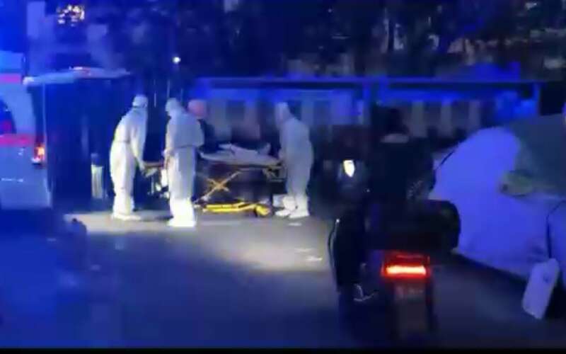 ▲4月26日,北京潘家园街道松榆西里社区,一名身处封控楼内的白血病患者被及时送往医院救治。 朝阳警方供图
