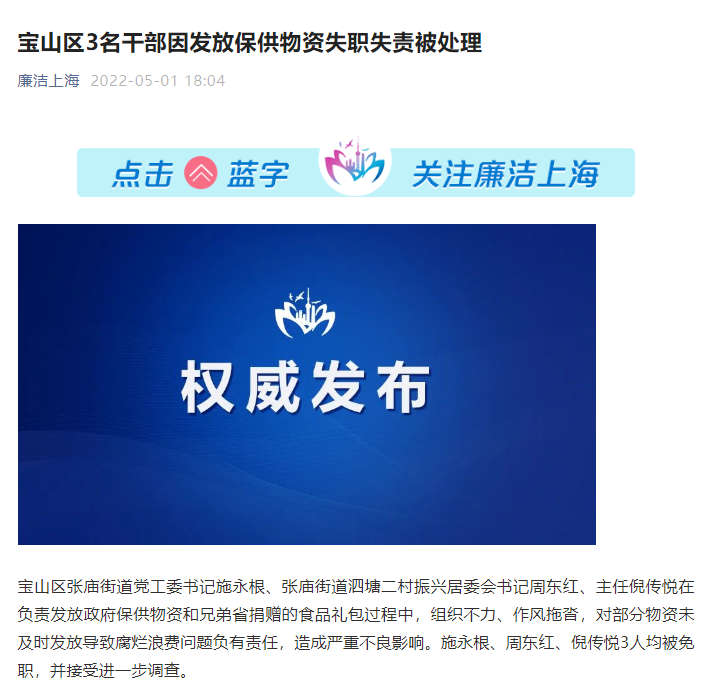 上海宝山区张庙街道党工委书记施永根、张庙街道泗塘二村振兴居委会书记周东红、主任倪传悦在负责发放政府保供物资和兄弟省捐赠的食品礼包过程中,组织不力、作风拖沓,对部分物资未及时发放导致腐烂浪费问题负有责任,造成严重不良影响。施永根、周东红、倪传悦3人均被免职,并接受进一步调查。