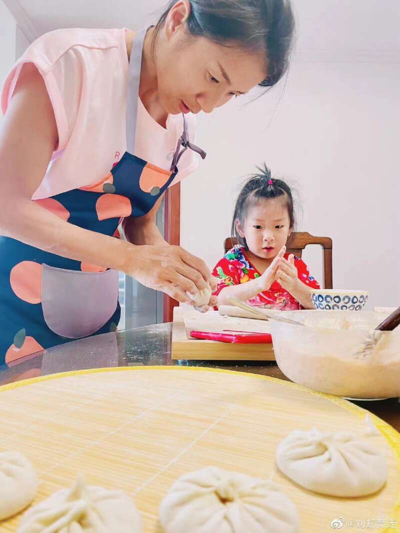 刘虹在家与女儿一起包包子(图片来自刘虹微博)