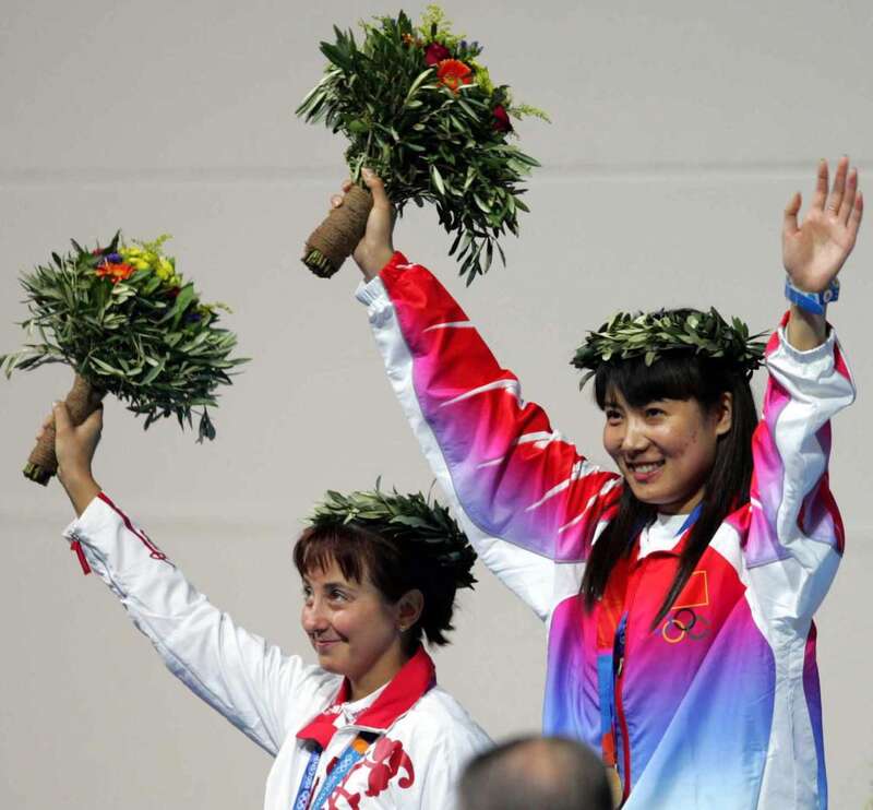 2004年8月14日,中国选手杜丽(右)夺得雅典奥运会射击女子10米气步枪金牌。