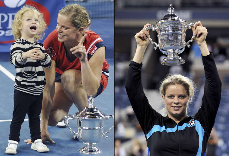 左图:2009年9月13日,比利时网球选手克里斯特尔斯(右)在获得美国网球公开赛女单冠军后和女儿在一起。