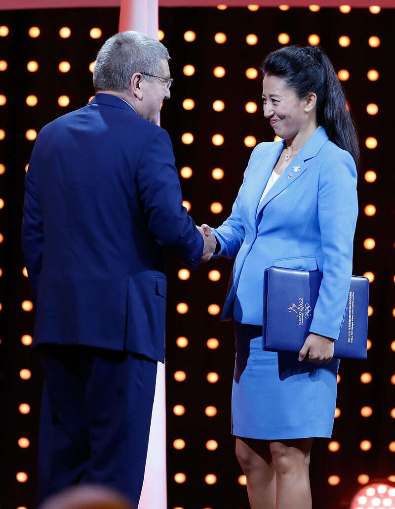 2015年7月31日,在国际奥委会第128次全会上,2022年冬奥会候选城市进行陈述。杨扬(右)与国际奥委会主席巴赫握手致意。
