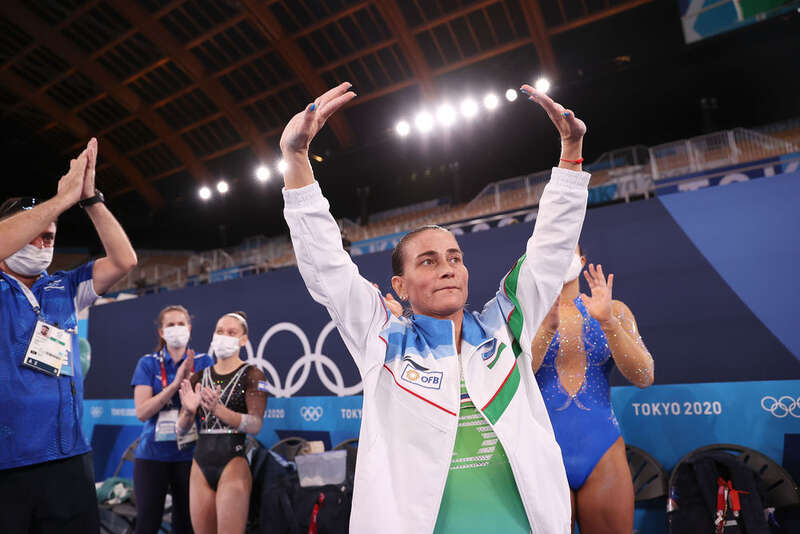 2021年7月25日,46岁的乌兹别克斯坦体操名将丘索维金娜在东京奥运会赛后向观众致意,这是她参加的第八届奥运会。