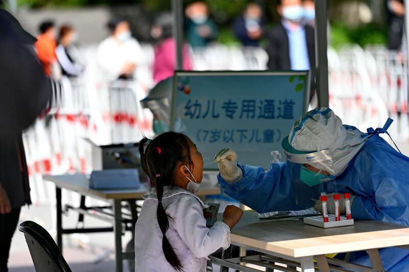 北京朝阳区小关街道奥林匹克文化广场核酸检测点设置“幼儿专用通道”。张正晔/摄