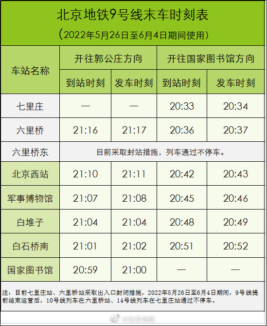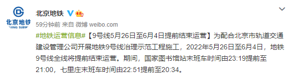 据@北京地铁消息,为配合北京市轨道交通建设管理公司开展地铁9号线治理示范工程施工,2022年5月26日至6月4日,地铁9号线全线将提前结束运营。期间,国家图书馆站末班车时间由23:19提前至21:00,七里庄末班车时间由22:51提前至20:34。