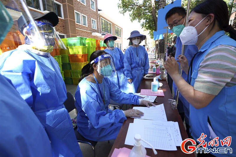 图为永定路街道太平路46号社区的党员干部和社区志愿者们布置发放现场。崔峻摄/光明图片/视觉中国