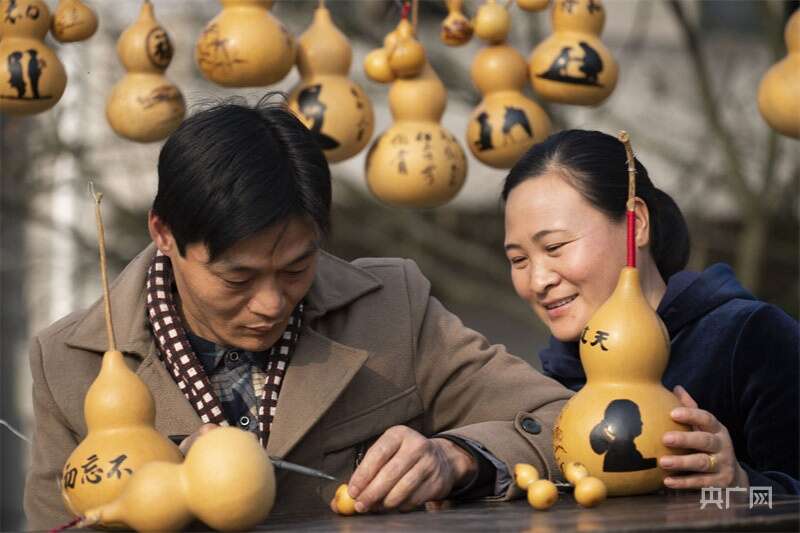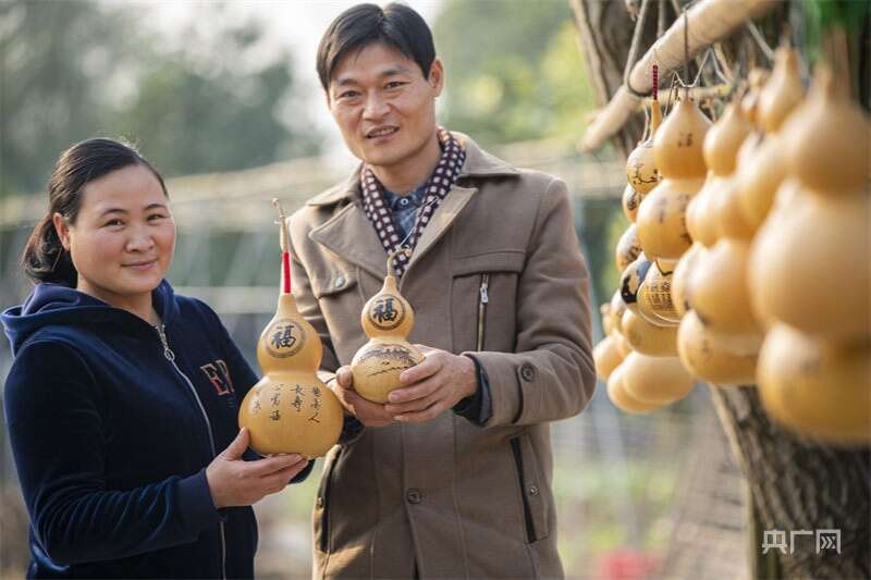 习小龙和妻子展示他们的葫芦作品。(央广网发 赵春亮 摄)
