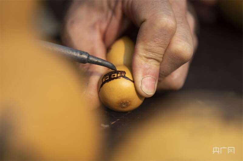 习小龙趁着养蜂冬闲时节创作他喜爱的葫芦作品,妻子付火秀则在一旁当他的助手。(央广网发 赵春亮 摄)