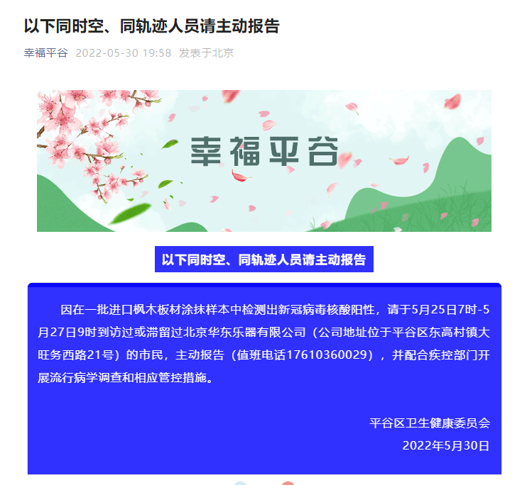 据微信公众号“幸福平谷”消息,北京市平谷区卫生健康委员会称,因在一批进口枫木板材涂抹样本中检测出新冠病毒核酸阳性,请于5月25日7时—5月27日9时到访过或滞留过北京华东乐器有限公司(公司地址位于平谷区东高村镇大旺务西路21号)的市民,主动报告(值班电话17610360029),并配合疾控部门开展流行病学调查和相应管控措施。