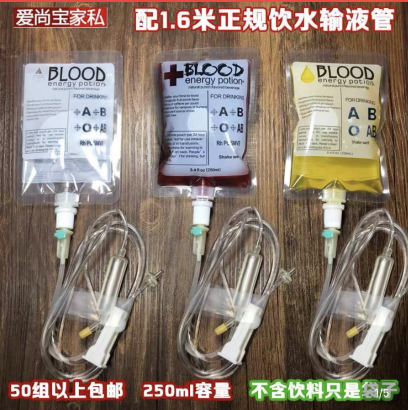 记者还看到,有不少商家推出模仿医疗器械输液吊袋外观的“输液饮料”。输入“输液饮料”字样也跳出了许多网店,输液袋挂架、输液袋、输液管和流速调节器等一应俱全。一位网民评论说“今晚成功吸血,饱了!”,不少网民担心这些“搞怪”食品对孩子产生不良影响。