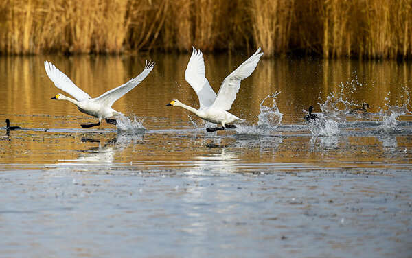 向南迁徙的天鹅在位于内蒙古巴彦淖尔市的乌梁素海停留觅食。(新华社发)