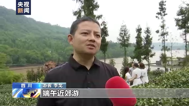四川游客 李戈:端午近郊游,我们今天专门来体验一下采茶,亲近一下大自然,这个端午过得特别有意思,安逸。