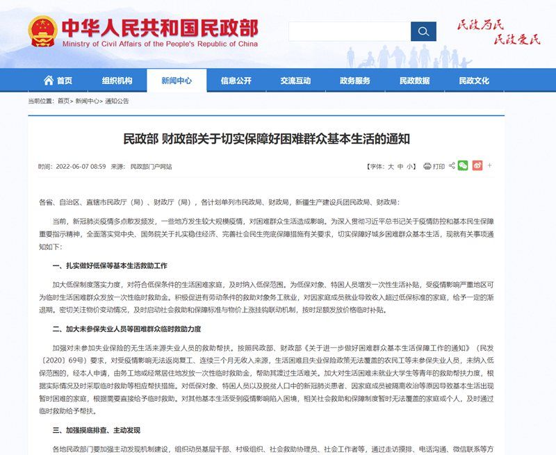 中国青年报客户端北京6月7日电(中青报·中青网记者 先藕洁)民政部、财政部近日联合印发《关于切实保障好困难群众基本生活的通知》(以下简称《通知》),部署各地全面落实党中央、国务院关于扎实稳住经济、完善社会民生兜底保障措施有关要求,切实保障好城乡困难群众基本生活。