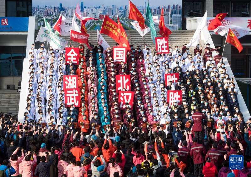 2020年3月10日,医护人员在武昌方舱医院前庆祝。当日,武汉所有方舱医院全部休舱。新华社记者 肖艺九 摄