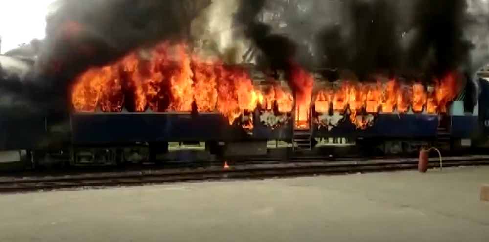 印度比哈尔邦的纳瓦达市,被抗议者烧毁的列车车厢 视频截图