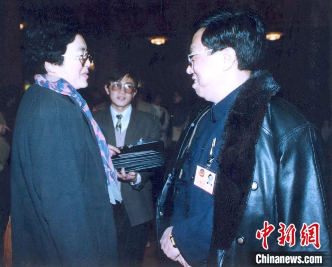 作家王蒙(右)与导演黄蜀芹交谈。黄蜀芹执导的电影《青春万岁》是改编自王蒙的同名小说。中新社发 蒲莉 摄