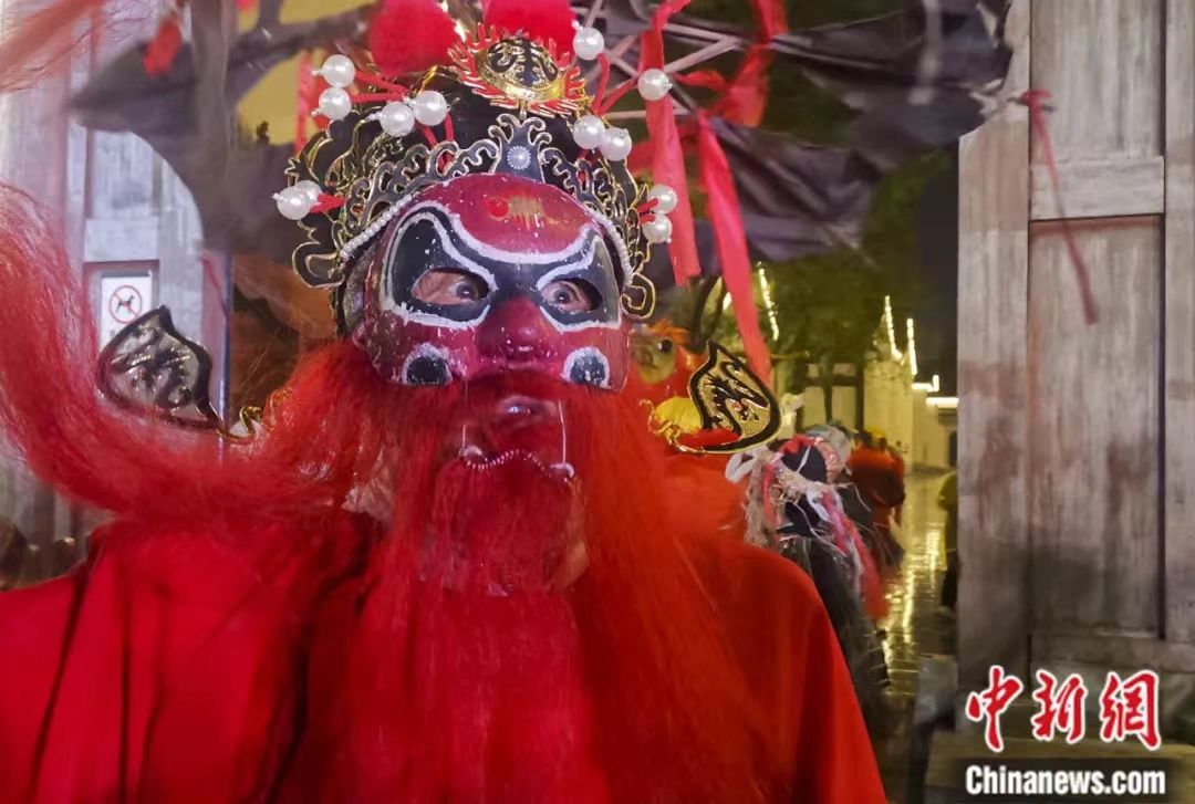 2021年10月,表演雄村跳钟馗的演员在安徽歙县徽州古城场外等待出场演出。中新社记者 杜洋 摄