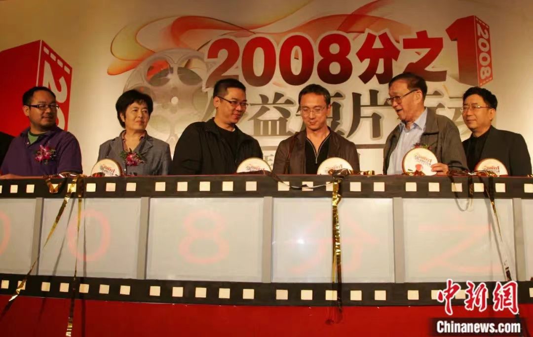 2008年,谢晋(右二)、黄蜀芹(左二)等在上海出席《2008分之1》公益短片启动仪式。中新社记者 潘索菲 摄