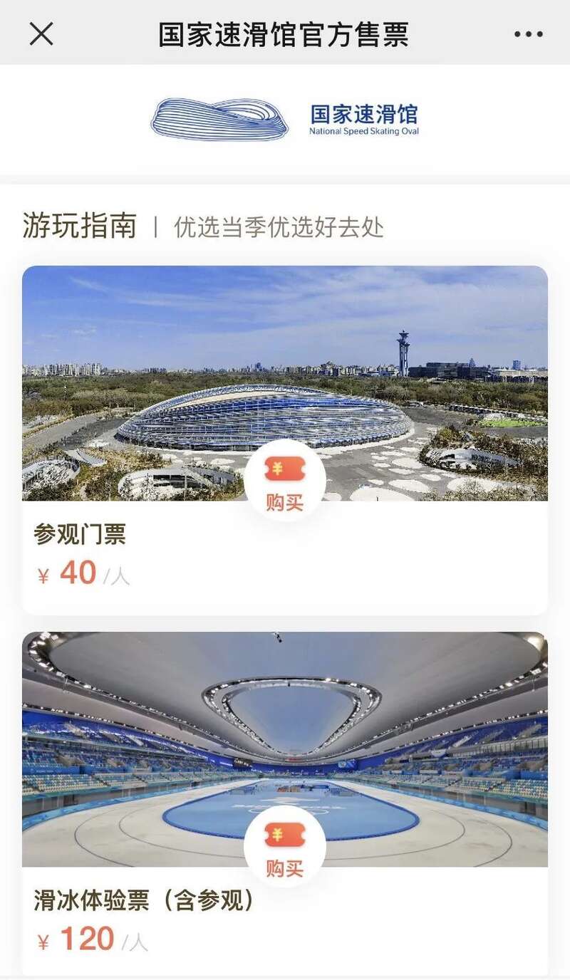 来这里参观可以通过微信关注“国家速滑馆”公众号进行票务预约。参观门票40元每人次。参观加上冰的套票120元每人次。根据游客需求,也可以现场购买80元每人次的滑冰体验票,其中包含了90分钟的滑冰体验和一套冰鞋一套护具。