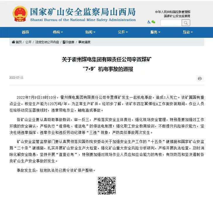 7月11日,国家矿山安全监察局山西局发布通报,2022年7月9日18时10分,霍州煤电集团有限责任公司辛置煤矿发生一起机电事故,造成1人死亡。事故发生后,驻地执法处已责令该矿停产整顿。