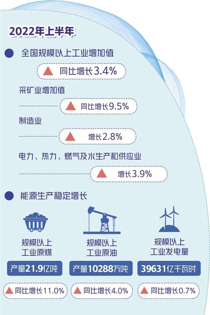 上半年,全国工业增加值同比增长3.4%。从三大门类看,能源、原材料保供稳价等政策效果明显,采矿业增加值同比增长9.5%;制造业增长2.8%;电力、热力、燃气及水生产和供应业增长3.9%。在41个大类行业中,33个行业实现正增长,其中9个行业两位数增长。